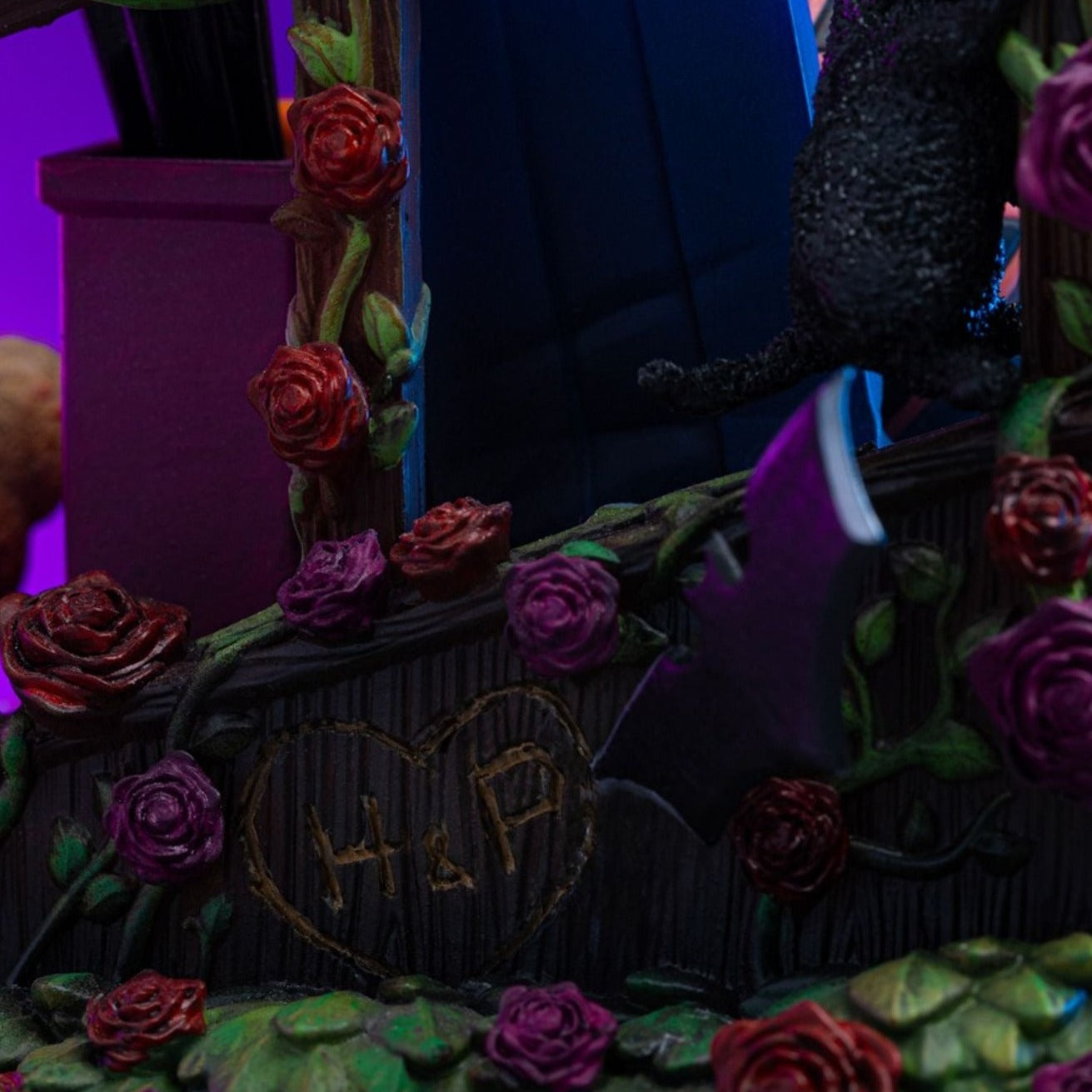 In this Deluxe version, we see Harley balancing on her left leg and supporting herself with her right hand on a baseball bat. The base forms a diorama in which Harleen crushes the chest of a Joker plushie with her bat, leaning against a wooden railing covered with green vines and red flowers with a batarang stuck in it, a small High Striker toy with a broken top depicting Punchline, the new devotee of the sinister clown villain, serves as a support for her giant mallet. In front of her, a box with weapons and gadgets characteristic of other iconic local criminals, including the utility belt of her rival hero, souvenirs of past clashes, shares space with another plushie of her pet hyena named Bruce. In this chaotic environment, two kittens playing among doubloons and gold bars, alongside the ground vegetation and flowers reference her allies.
