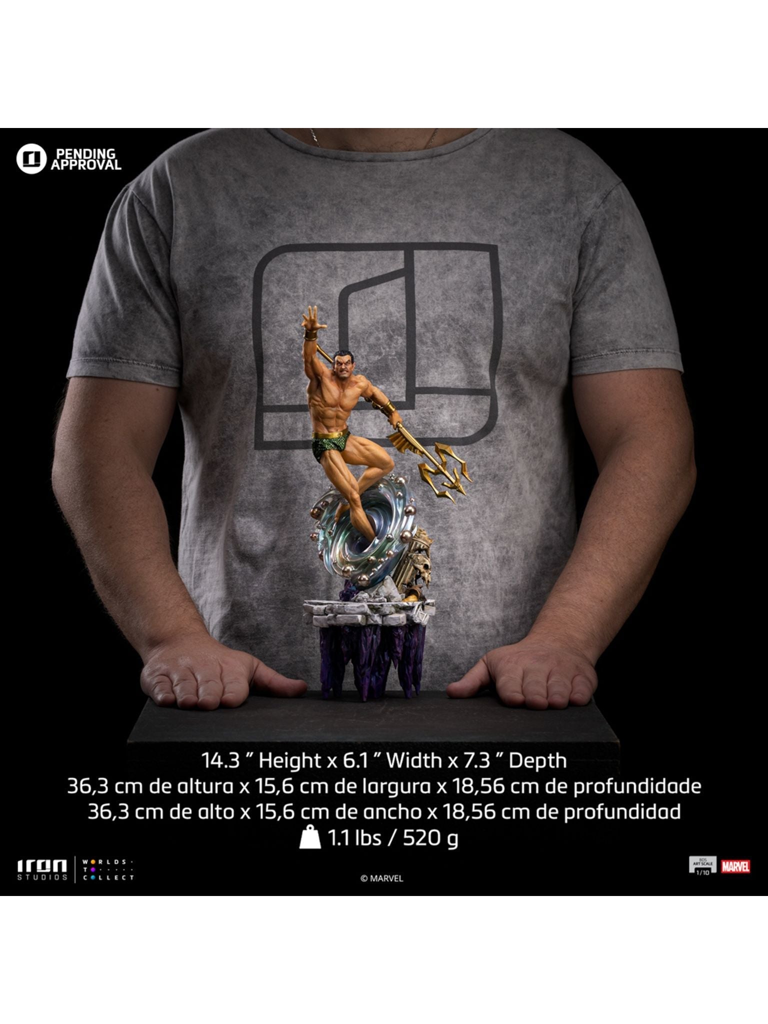 Following the quality standards of the Art Scale 1/10 line by Iron Studios, the Namor – Infinity Gauntlet Diorama – Art Scale 1/10 statue will also be produced using the same materials, with Polystone as the main component. It may also include parts made from resin, PVC, metal, and fabric to enhance its structure and raise the immersion of the representation.