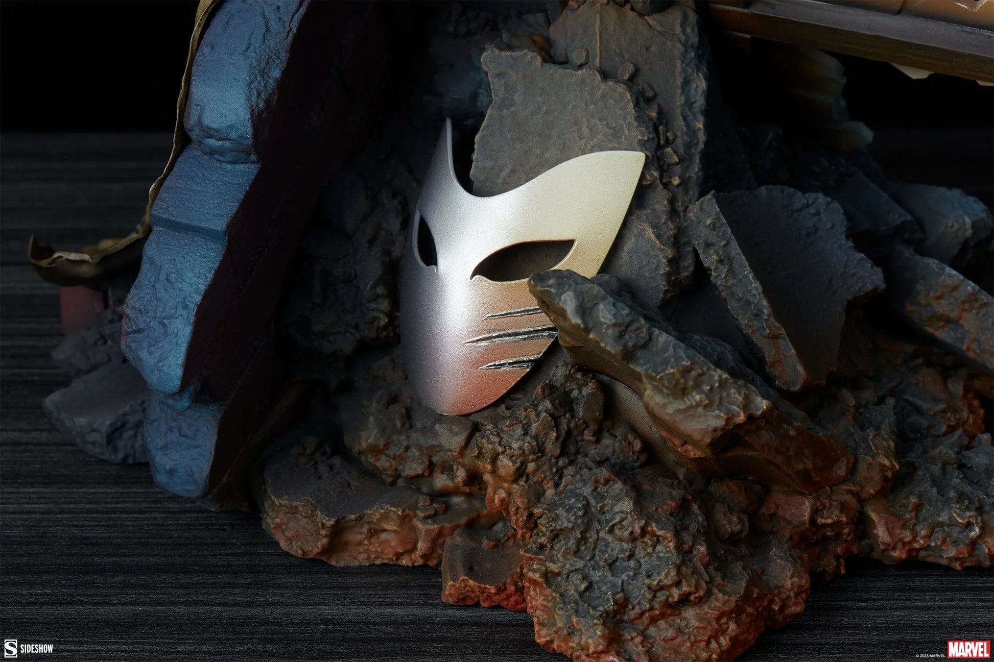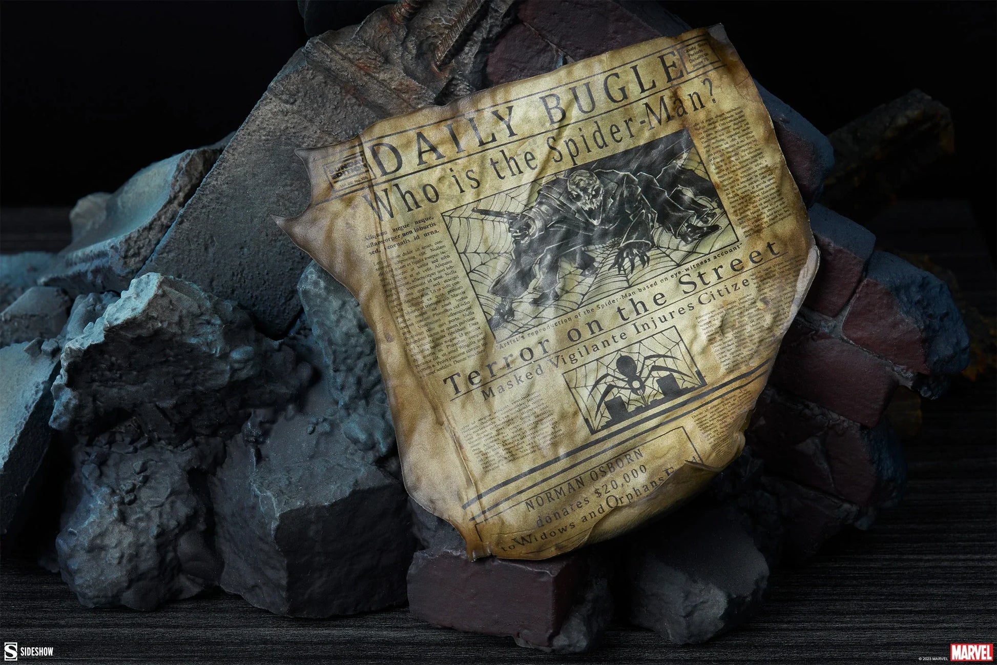 It’s a cold, dark night on Earth-90214, also known as Earth-Noir. The Great Depression sweeps New York City and super heroes are practically unheard of — until along swings a Spider-Man. The Spider-Man Noir Premium Format Figure measures 26.75” tall and 21” wide in a dramatic, dynamic display angled along a dilapidated building. This massive Marvel statue is packed with detail from the tip of his grappling hook to the bottom of the rubble-covered base. Use your private investigator skills to spot Easter eggs including a newspaper article with references to the original comic series, Felicia Hardy’s White Widow mask, and a gargoyle design paying tribute to Peter Parker’s adventures in another timeline.