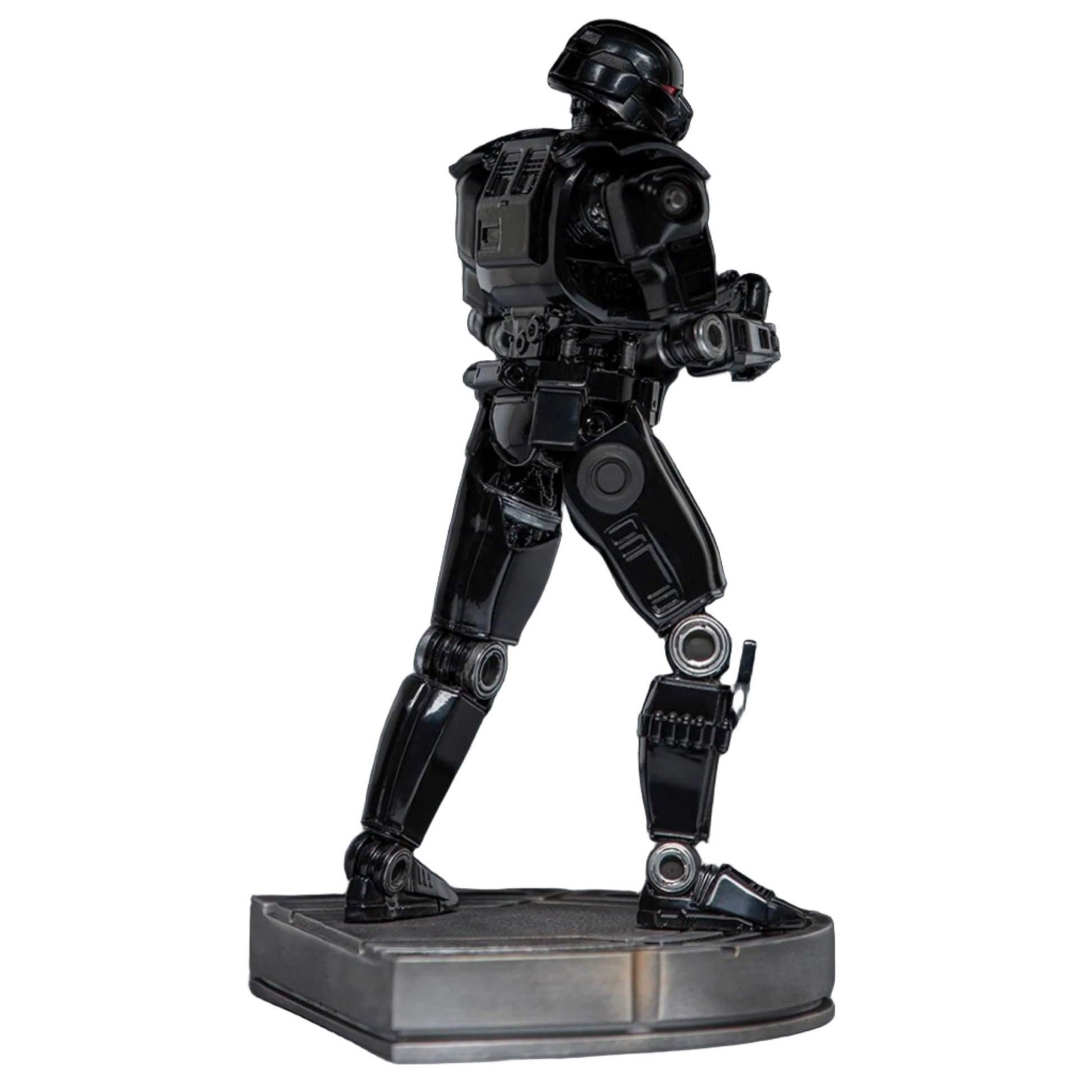 A figure covered in shining black armor is aboard Imperial Officer Moff Gideon's space cruiser, directing his red photoreceptor eyes towards his objective, wielding a large blaster rifle and ready to fire with precision at any target. Iron Studios thus presents its statue of the fearsome "Dark Trooper", one of the most efficient and powerful Imperial combat droids. Just as seen in the second season of The Mandalorian series, a spin-off from Star Wars on the Disney+ streaming channel. Unveiled firsthand in the Sideshow Con virtual event, a must-have for Star Wars fans and collectors, the statue has two pairs of interchangeable hands, giving you the option of different ways to display.